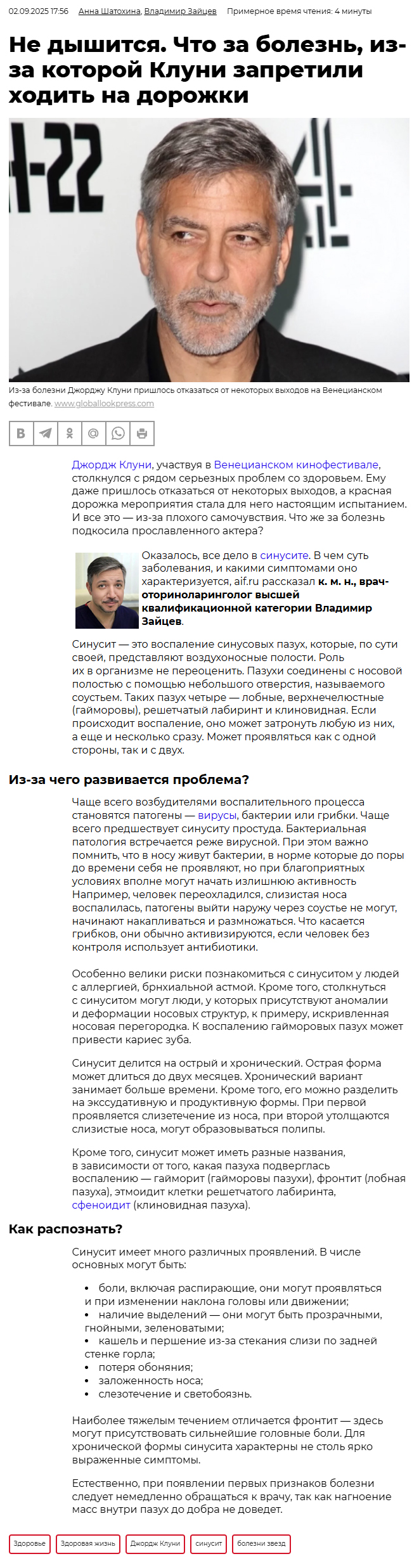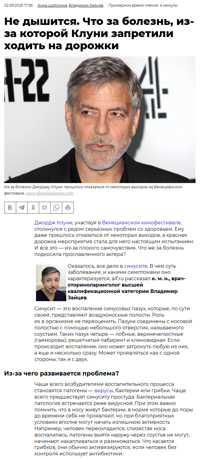 Статья в онлайн-версии газеты "Аргументы и Факты" - Не дышится. Что за болезнь, из-за которой Клуни запретили ходить на дорожки
