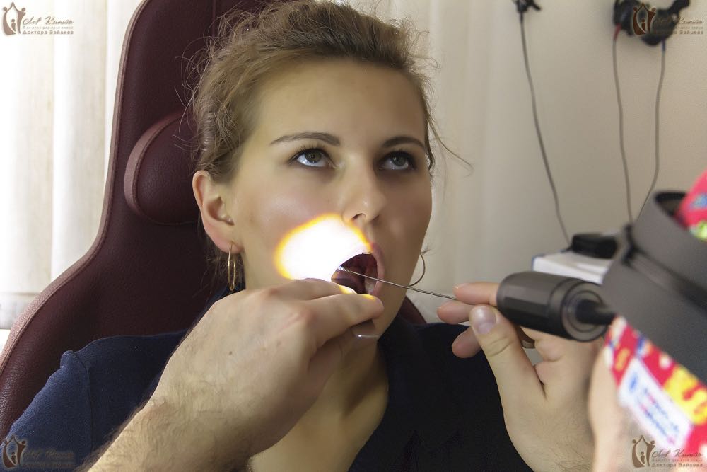 Оториноларинголог нашей клиники проводит сеанс лазеротерапевтического воздействия на ткани нёбных миндалин и слизистую оболочку задней стенки глотки. Лечение тонзиллита у взрослых лазером очень эффективно. Его действие направлено на снижение отёка и воспаления тканей нёбных миндалин.